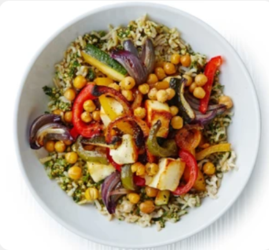 Herby rice with roasted veg, chickpeas & halloumi Halloumi, Veggie