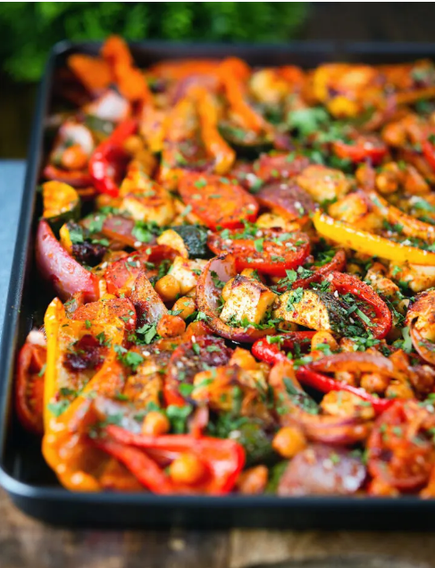 Halloumi Cheese Tray Bake with Chickpeas and Harissa Halloumi, Veggie