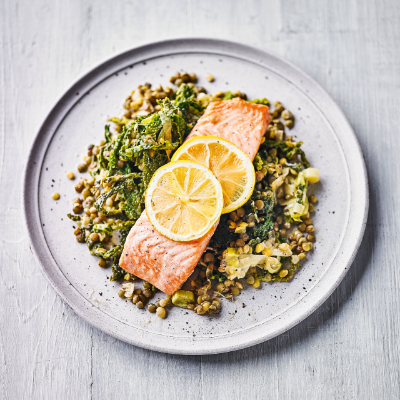 Rainbow trout with mustardy lentils & Savoy cabbage Trout
