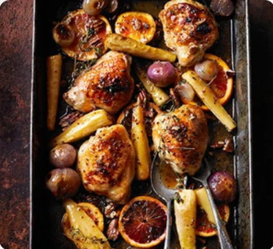 Sticky orange chicken with parsnips, maple & pecans Chicken